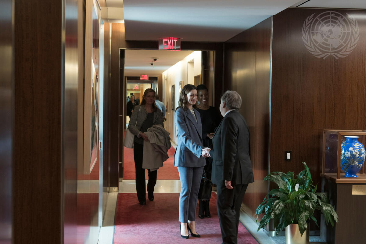 Secretary-General António Guterres (right) greets Anne Hathaway, Global Goodwill Ambassador for the United Nations Entity for Gender Equality and the Empowerment of Women (UN Women).