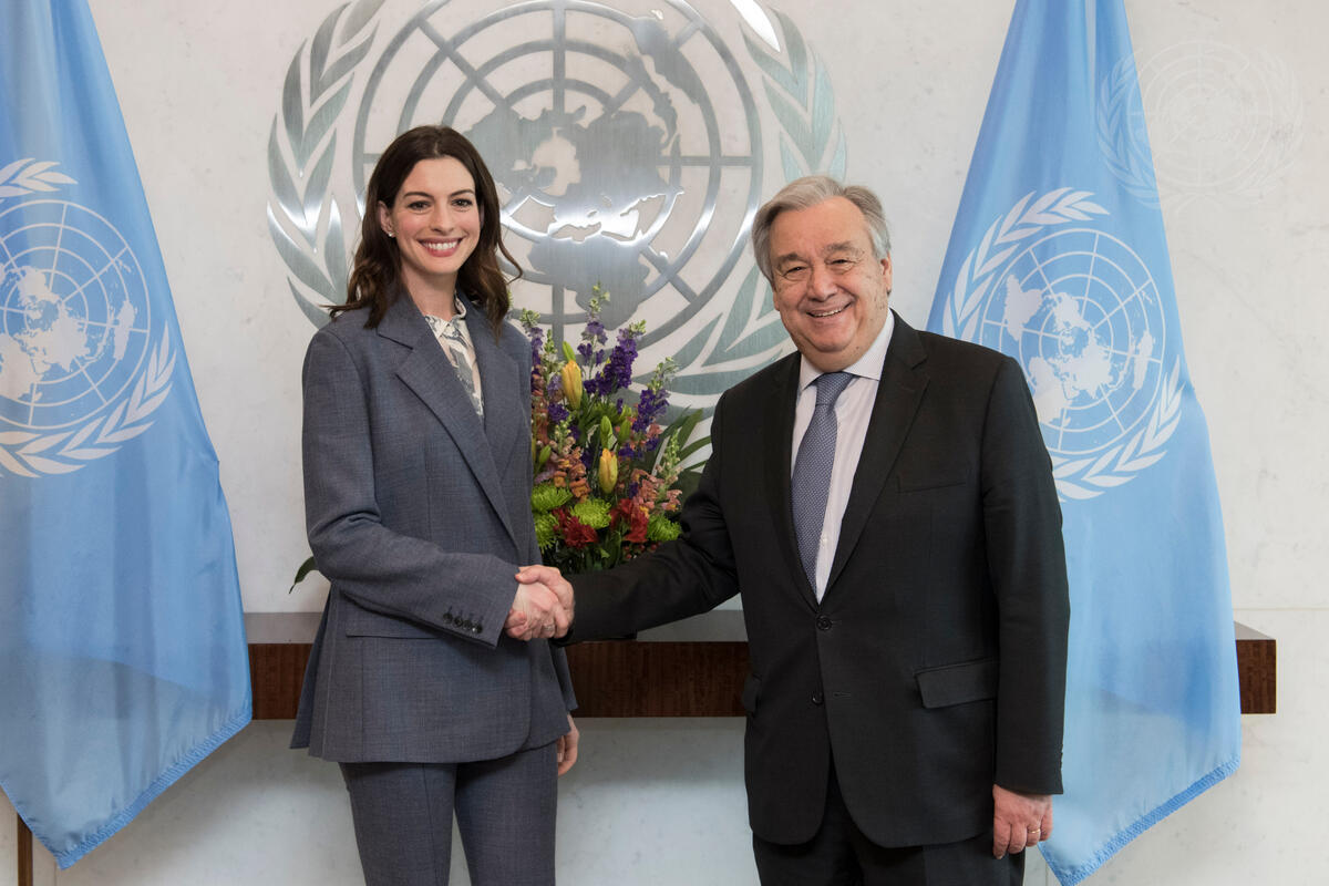 Secretary-General António Guterres (right) meets with Anne Hathaway, Global Goodwill Ambassador for the United Nations Entity for Gender Equality and the Empowerment of Women (UN Women).