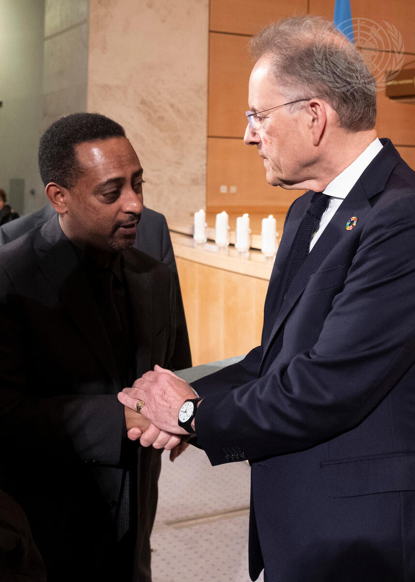 Michael Møller (right), Director-General of the United Nations Office at Geneva, greets Yoseph Kassaye Yoseph, Deputy Permanent Representative of Ethiopia to to the United Nations Office at Geneva, during the ceremony held in Geneva for fallen United Nations personnel aboard Ethiopian Airlines flight ET302. The plane crash of 10 March killed all 157 passengers and crew members onboard, of which 21 were confirmed to be UN staff.