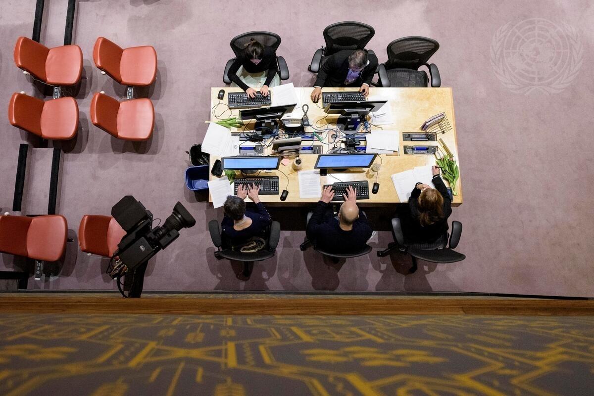 Verbatim reporters and press officers at work ahead of the Security Council meeting on the situation in Sudan and South Sudan. Flowers were given to women attending the Council meeting in celebration of International Women's Day.