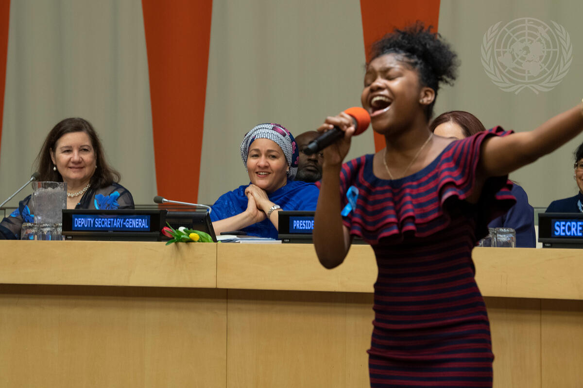 Drew Olivia Tillman, singer and actress, performs during the United Nations observance of International Women’s Day, on the theme “Think Equal, Build Smart, Innovate for Change”.