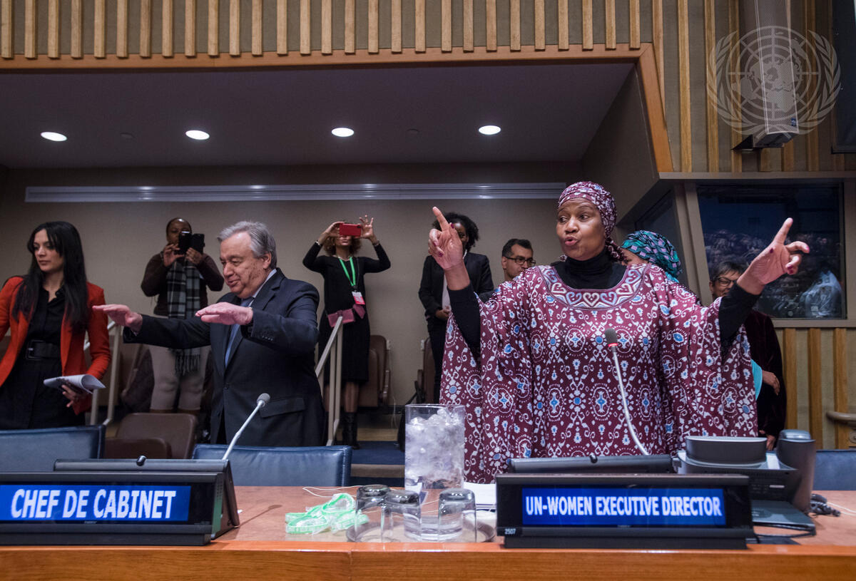Phumzile Mlambo-Ngcuka (right), Executive Director of the United Nations Entity for Gender Equality and the Empowerment of Women (UN Women), leads participants of a townhall meeting - held as part of the sixty-third session of the Commission on the Status of Women - in singing ""The Truth Shall Set You Free"", as Secretary-General António Guterres (left) arrives for the meeting.