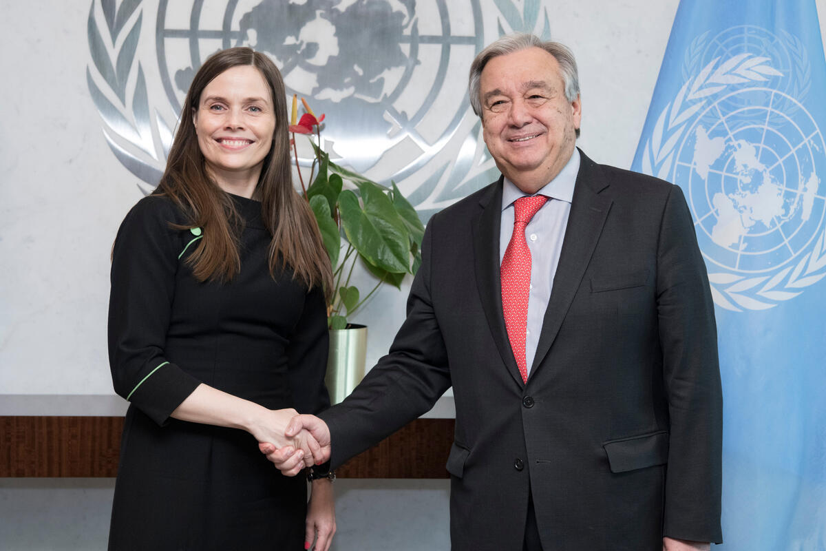 Secretary-General António Guterres (right) meets with Katrin Jakobsdottir, Prime Minister of the Republic of Iceland.