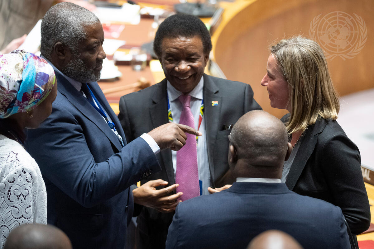 Federica Mogherini (right), High Representative of the European Union for Foreign Affairs and Security Policy, speaks with Job Obiang Esono Mbengono (left), Deputy Permanent Representative of Equatorial Guinea to the UN, and Jerry Matthews Matjila (centre), Permanent Representative of the Republic of South Africa to the UN, ahead of the Security Council meeting on cooperation between the United Nations and regional and sub-regional organizations in maintaining international peace and security, with a focus on European Union.