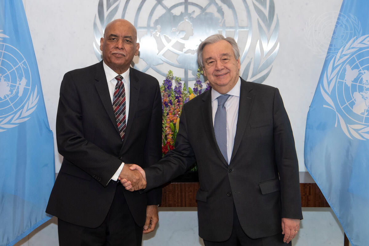 Omer Dahab Fadl Mohamed (left), Permanent Representative of the Republic of Sudan to the United Nations, pays a farewell call on Secretary-General António Guterres.