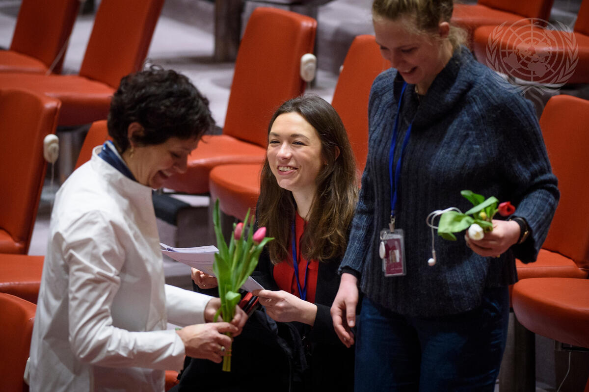 Delegates hold tulips after the Security Council meeting on the situation in Sudan and South Sudan. Flowers were given to each woman attending the Council meeting in celebration of International Women's Day.