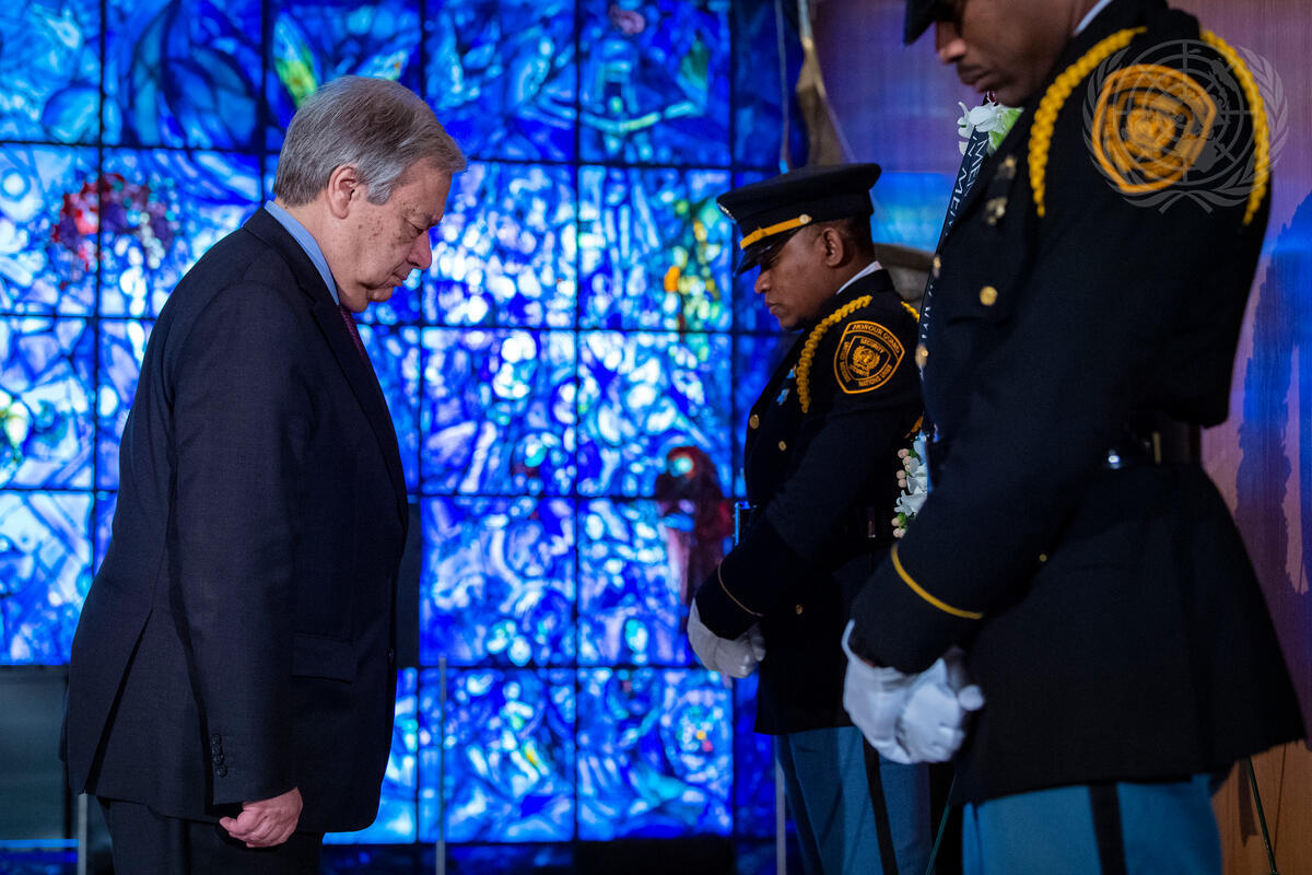 Secretary-General António Guterres pays his respects at the wreath-laying ceremony for fallen United Nations personnel aboard Ethiopian Airlines flight ET302. The plane crash of 10 March killed all 157 passengers and crew members onboard, of which 21 were confirmed to be UN staff.