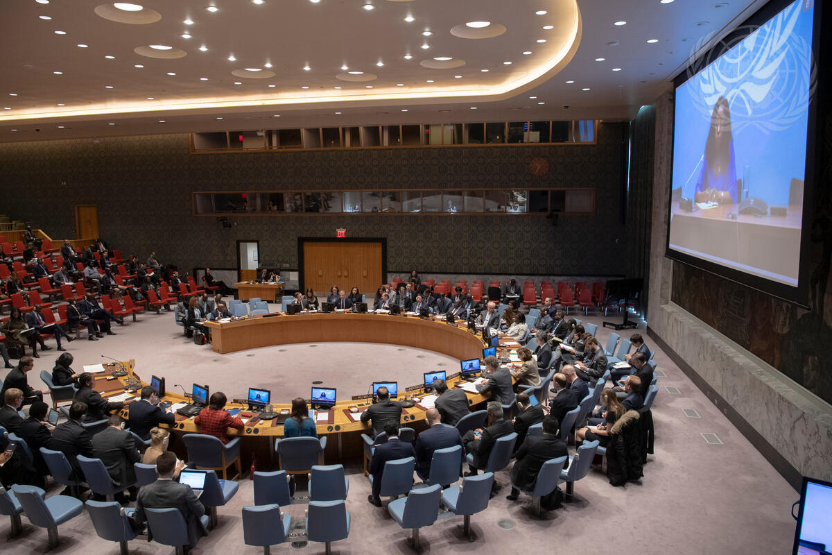 A wide view of the Security Council as Anny Tenga Modi (on screen), Executive Director of Afia Mama, briefs the Security Council on the situation concerning the Democratic Republic of the Congo.