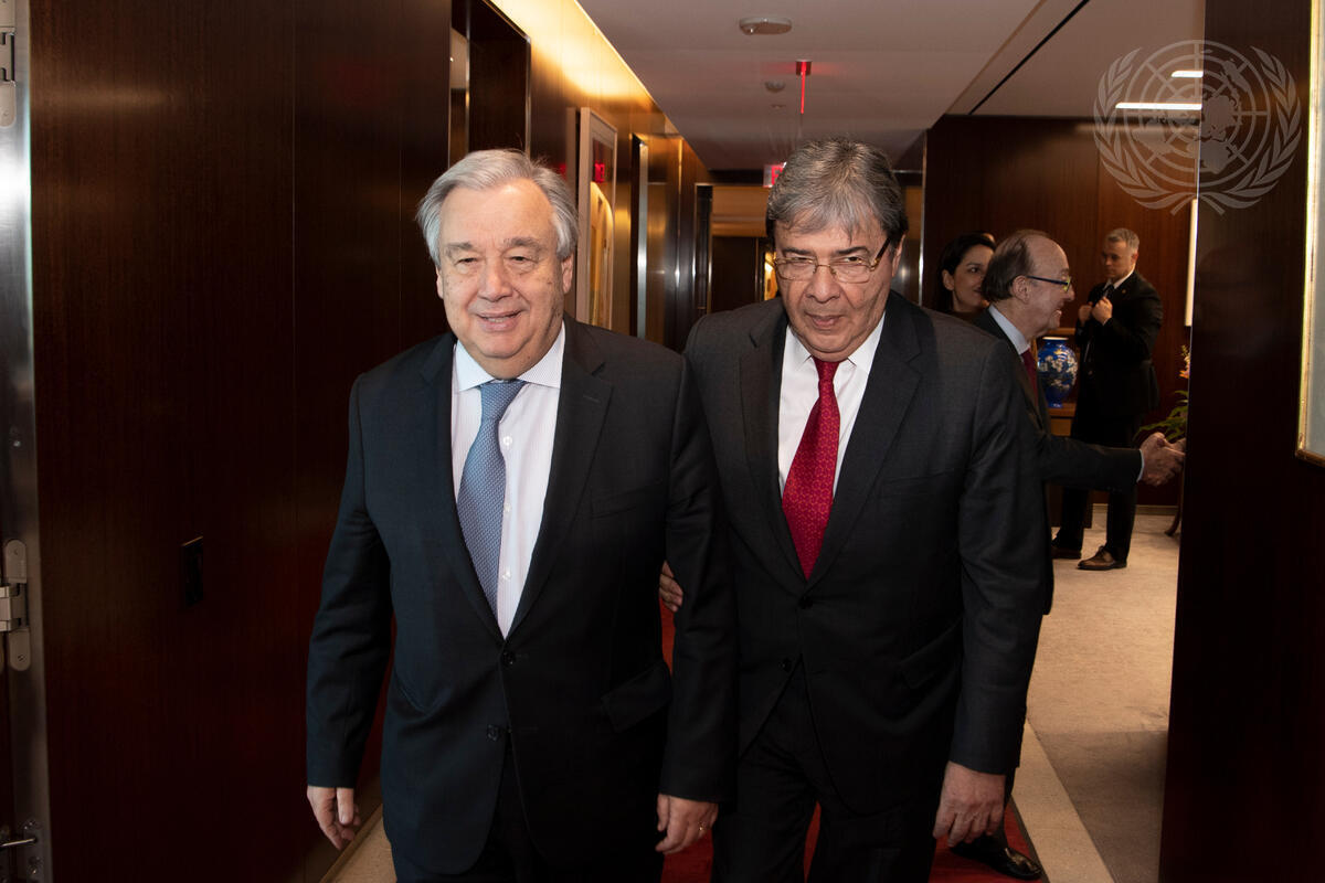 Secretary-General António Guterres (left) meets with Carlos Holmes Trujillo García, Minister for Foreign Affairs of the Republic of Colombia.