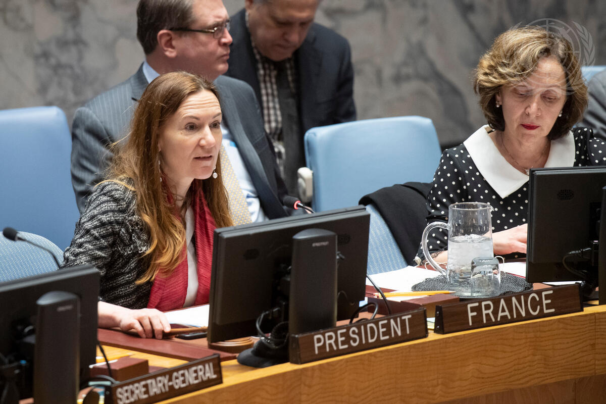Anne Gueguen, Deputy Permanent Representative of France to the United Nations and President of the Security Council for the month of March, chairs the Security Council meeting on the situation in Afghanistan. At right is Hasmik Egian, Director of the Security Council Affairs Division of the Department of Political and Peacebuilding Affairs (DPPA).