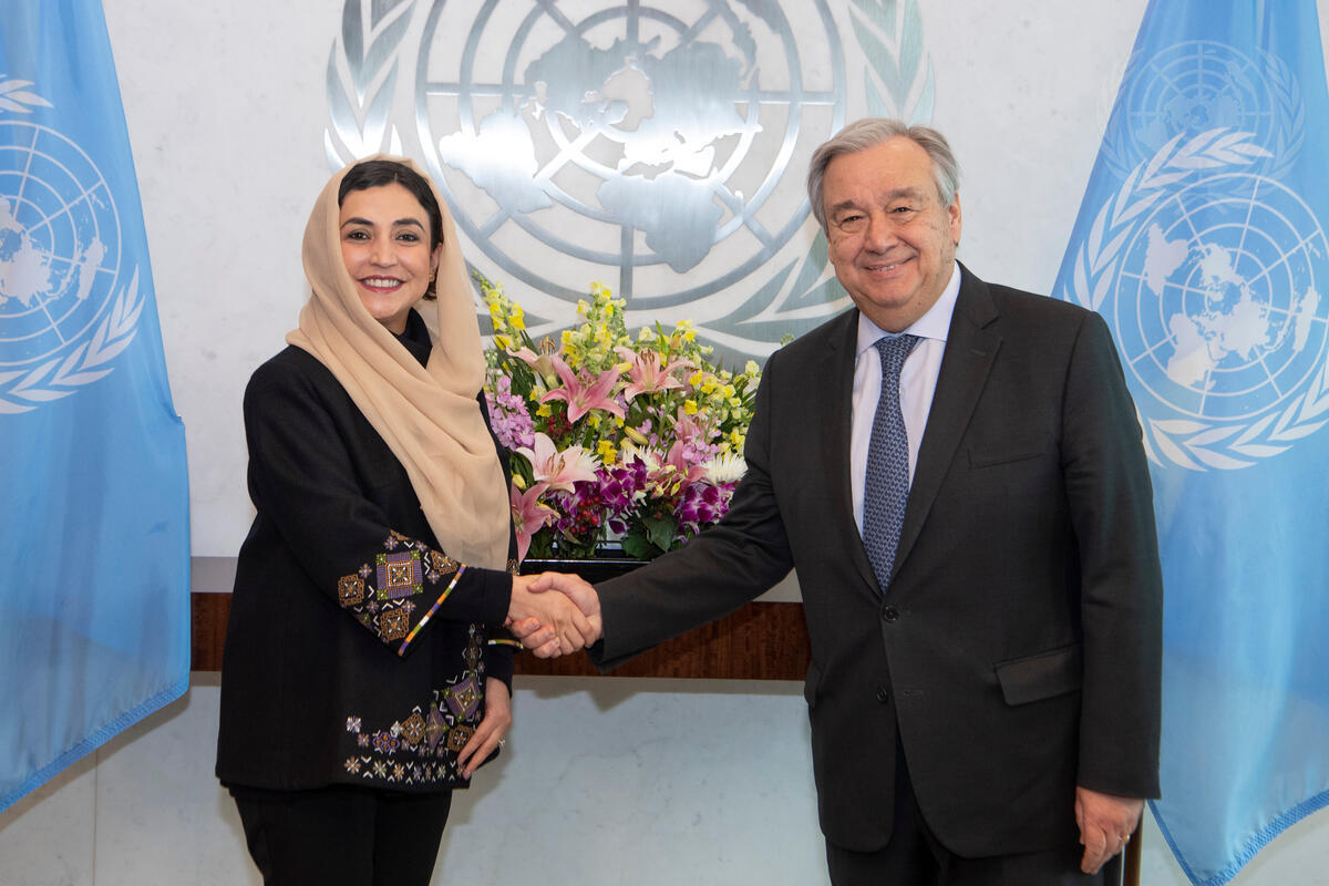 Adela Raz (left), new Permanent Representative of Islamic Republic of Afghanistan to the United Nations, presents her credentials to Secretary-General António Guterres.