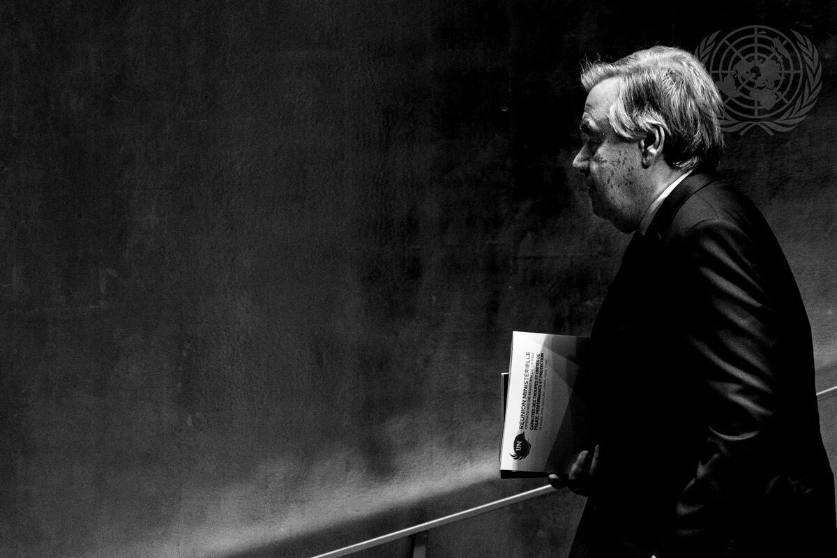 Secretary-General António Guterres leaves the podium after the opening of the 2019 United Nations Peacekeeping Ministerial meeting on the theme of ""Uniformed Capabilities, Performance and Protection"".