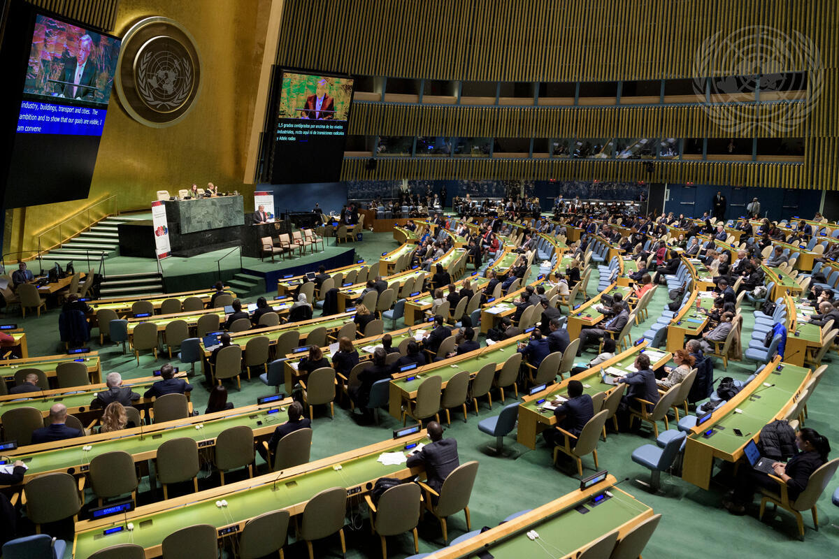 Secretary-General António Guterres (on screens and at podium), makes remarks to the high-level meeting on Climate and Sustainable Development for All. The meeting was themed ""Protection of the Global Climate for Present and Future Generations of Humankind in the Context of the Economic, Social and Environmental Dimensions of the 2030 Agenda for Sustainable Development"".