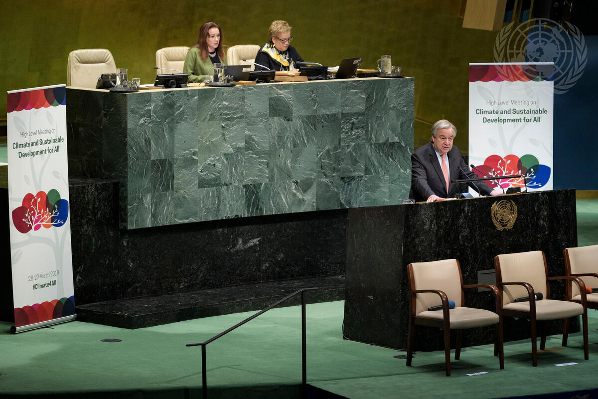 Secretary-General António Guterres (at podium), makes remarks to the high-level meeting on Climate and Sustainable Development for All. The meeting was themed ""Protection of the Global Climate for Present and Future Generations of Humankind in the Context of the Economic, Social and Environmental Dimensions of the 2030 Agenda for Sustainable Development"".