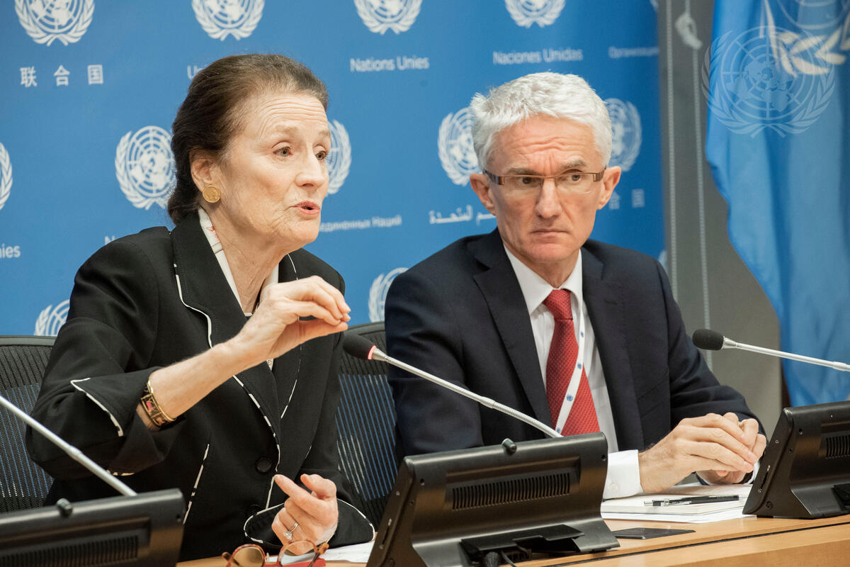 Henrietta Fore (left), Executive Director of the UN Children’s Fund (UNICEF) and Mark Lowcock, Under-Secretary-General for Humanitarian Affairs and Emergency Relief Coordinator, brief journalists on their recent visit to the Democratic Republic of the Congo as guests at the noon briefing.