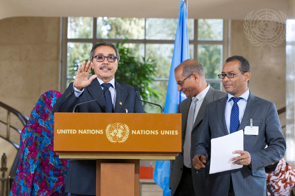 Khatri Addouh, Member of the National Secretariat of the Frente Polisario and Head of the Negotiating team, speaks to press at the end of the Second roundtable on Western Sahara in Geneva.
