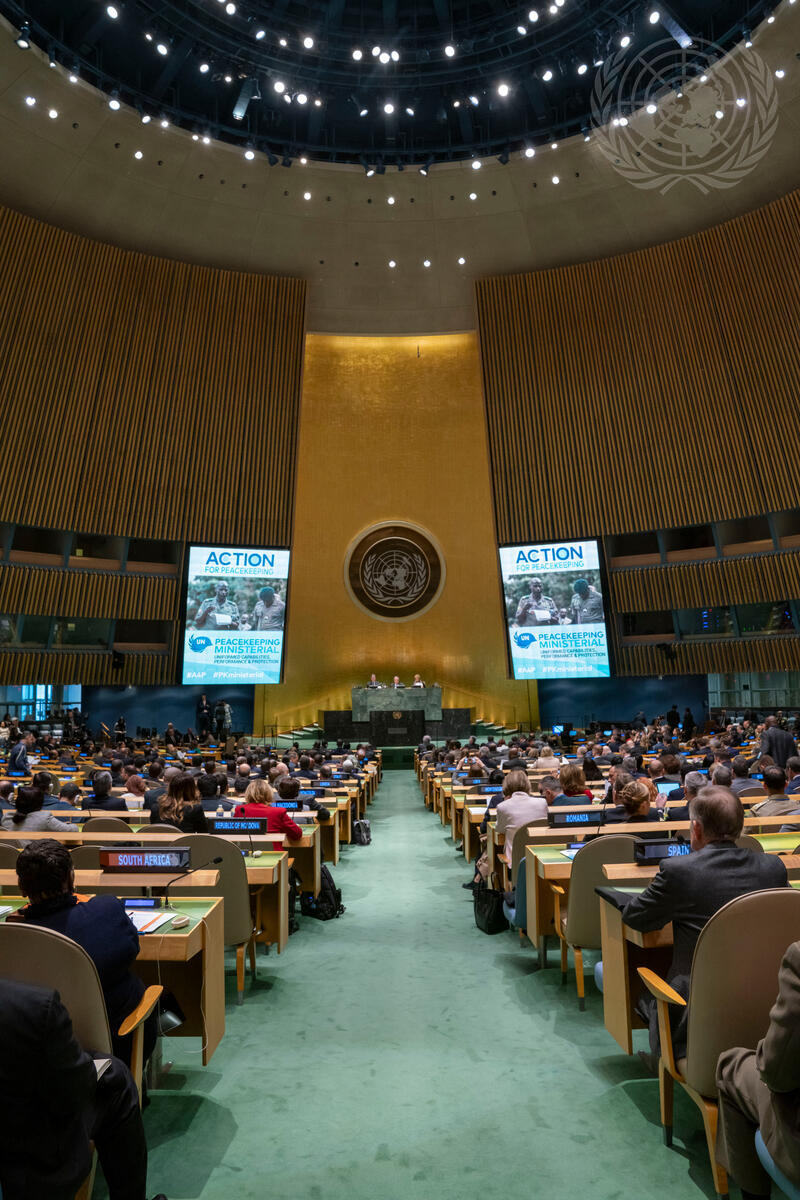 A view of the General Assembly hall during the opening of the 2019 United Nations Peacekeeping Ministerial meeting on the theme of ""Uniformed Capabilities, Performance and Protection"".