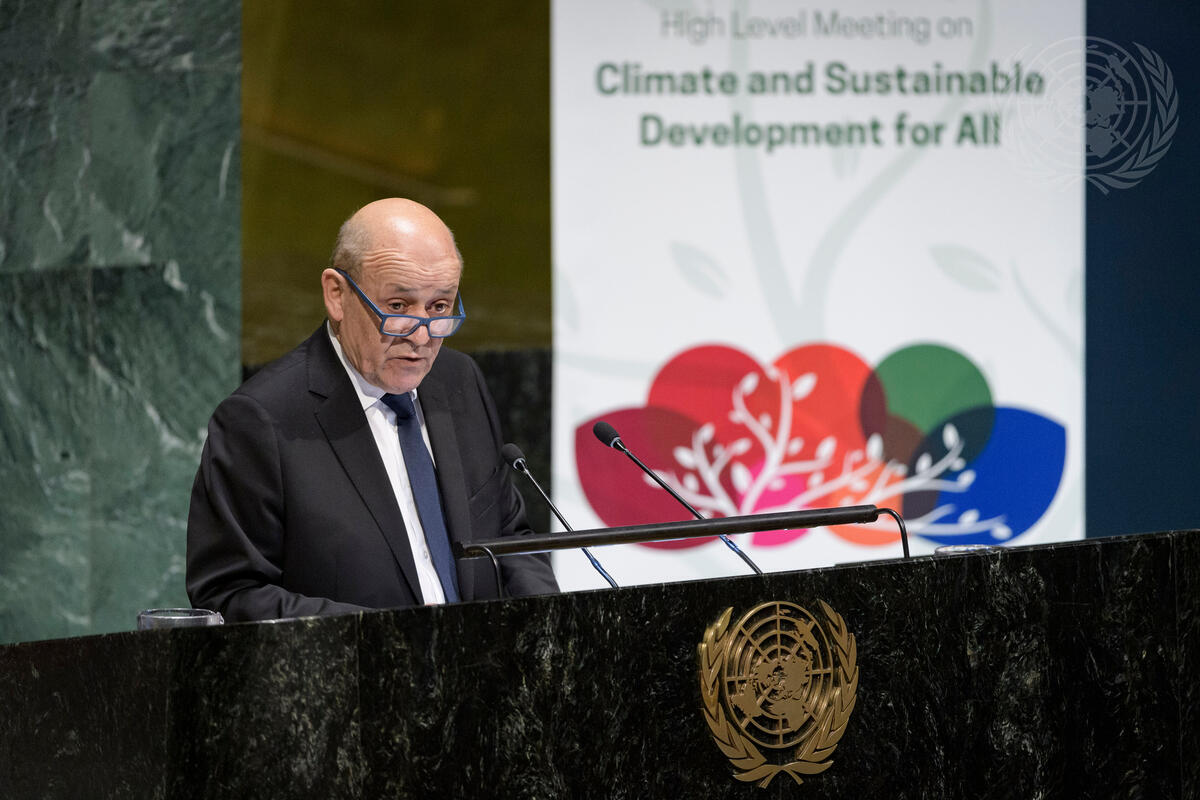 Jean-Yves Le Drian, Minister for Europe and Foreign Affairs of France, addresses the high-level meeting on Climate and Sustainable Development for All. The meeting was themed ""Protection of the Global Climate for Present and Future Generations of Humankind in the Context of the Economic, Social and Environmental Dimensions of the 2030 Agenda for Sustainable Development"".