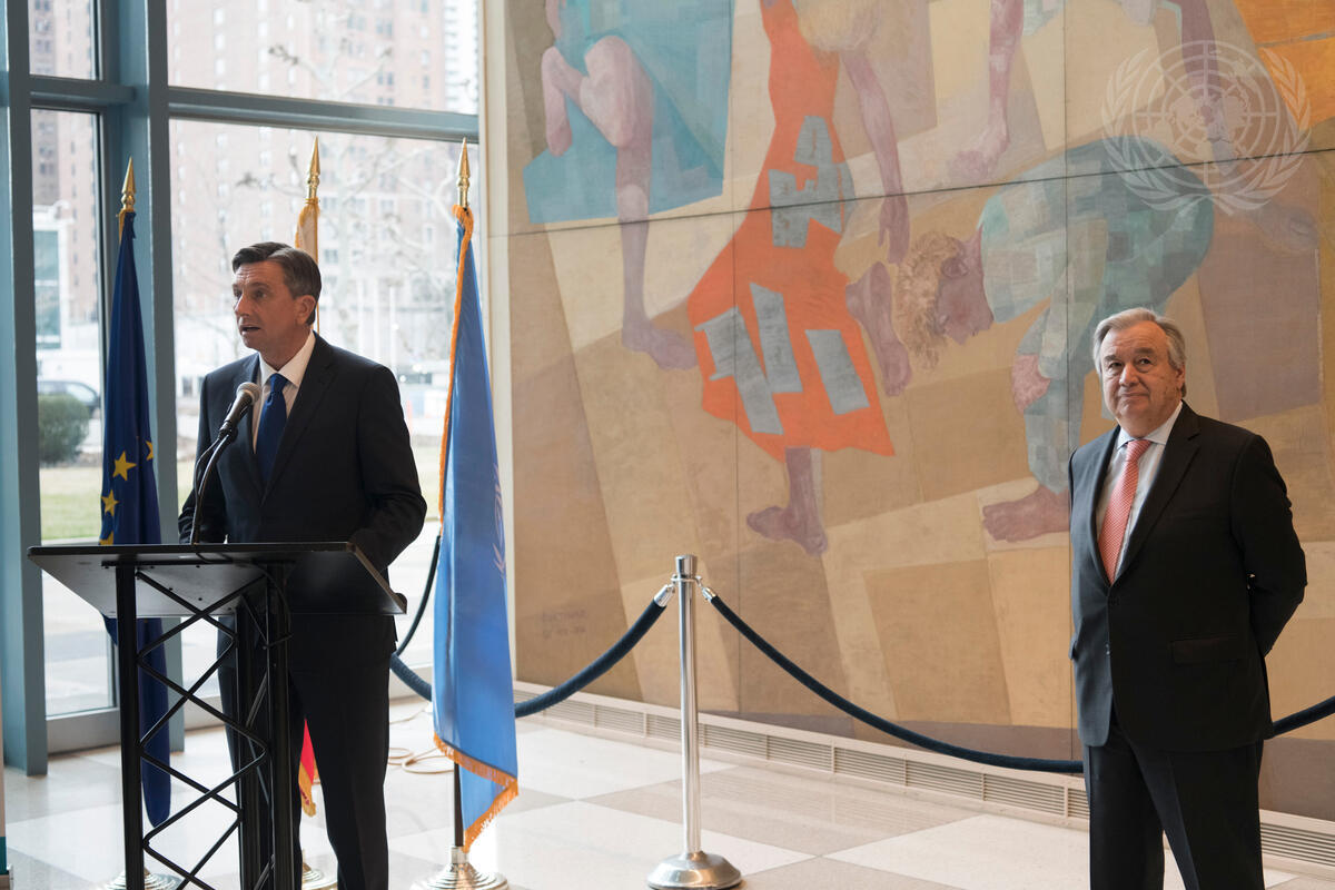 Borut Pahor, President of the Republic of Slovenia, speaks at the opening of the photo exhibition titled ""20 Years of Slovenian Commitment to Humanitarian Mine Action"". At right is Secretary-General António Guterres.