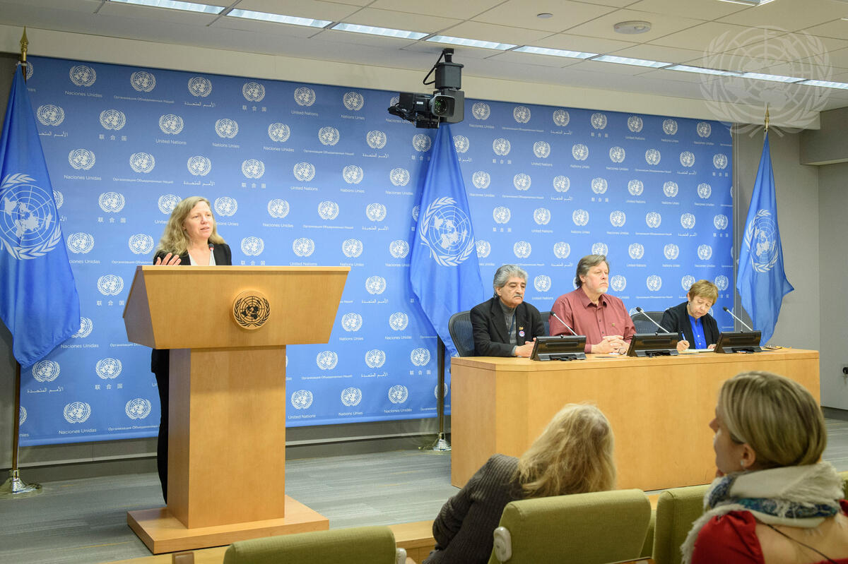 Margaret Flowers (standing), politician and activist from the United States, speaks at a press briefing sponsored by the Permanent Mission of the Bolivarian Republic of Venezuela to the United Nations.
