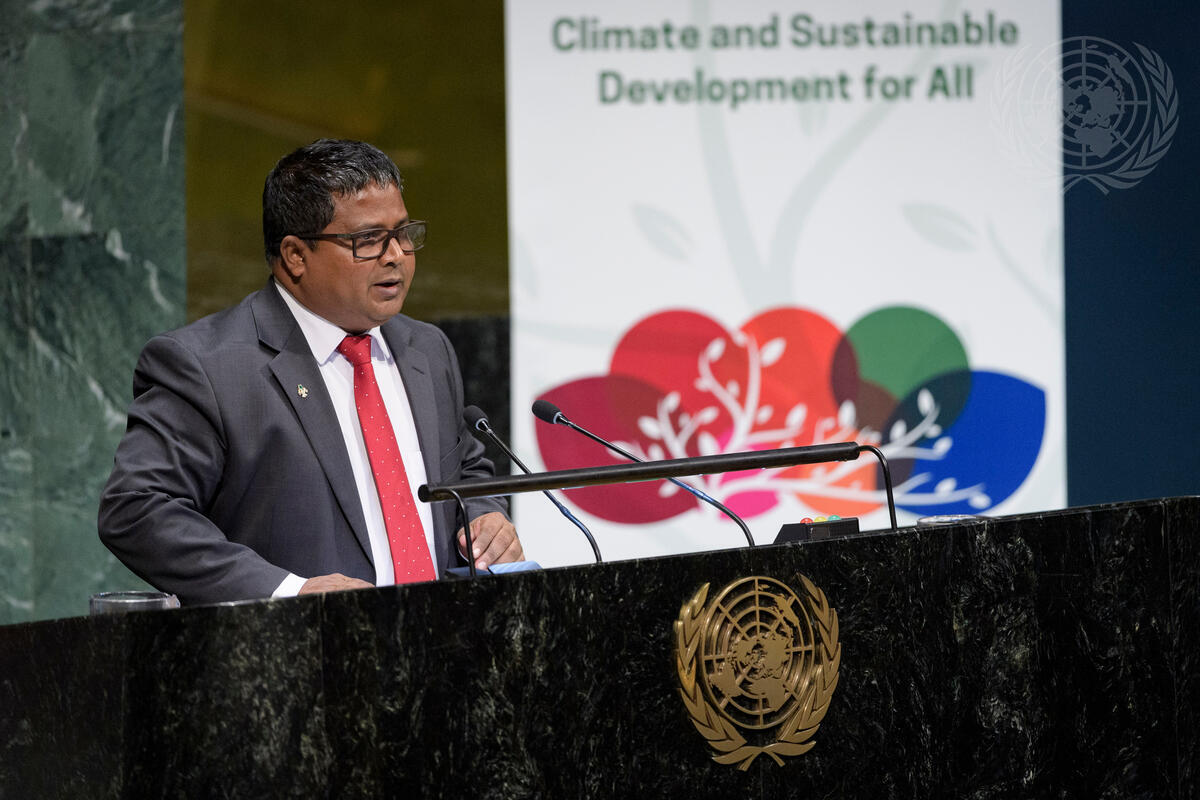 Hussain Rasheed Hassan, Minister of Environment of the Republic of the Maldives, addresses the high-level meeting on Climate and Sustainable Development for All. The meeting was themed ""Protection of the Global Climate for Present and Future Generations of Humankind in the Context of the Economic, Social and Environmental Dimensions of the 2030 Agenda for Sustainable Development"".