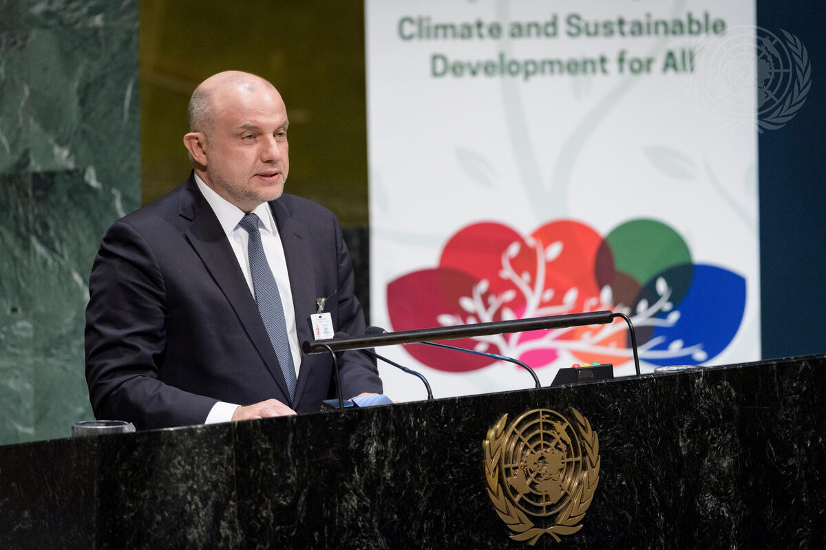 Jüri Luik, Minister of Defence of Estonia, addresses the high-level meeting on Climate and Sustainable Development for All. The meeting was themed ""Protection of the Global Climate for Present and Future Generations of Humankind in the Context of the Economic, Social and Environmental Dimensions of the 2030 Agenda for Sustainable Development"".