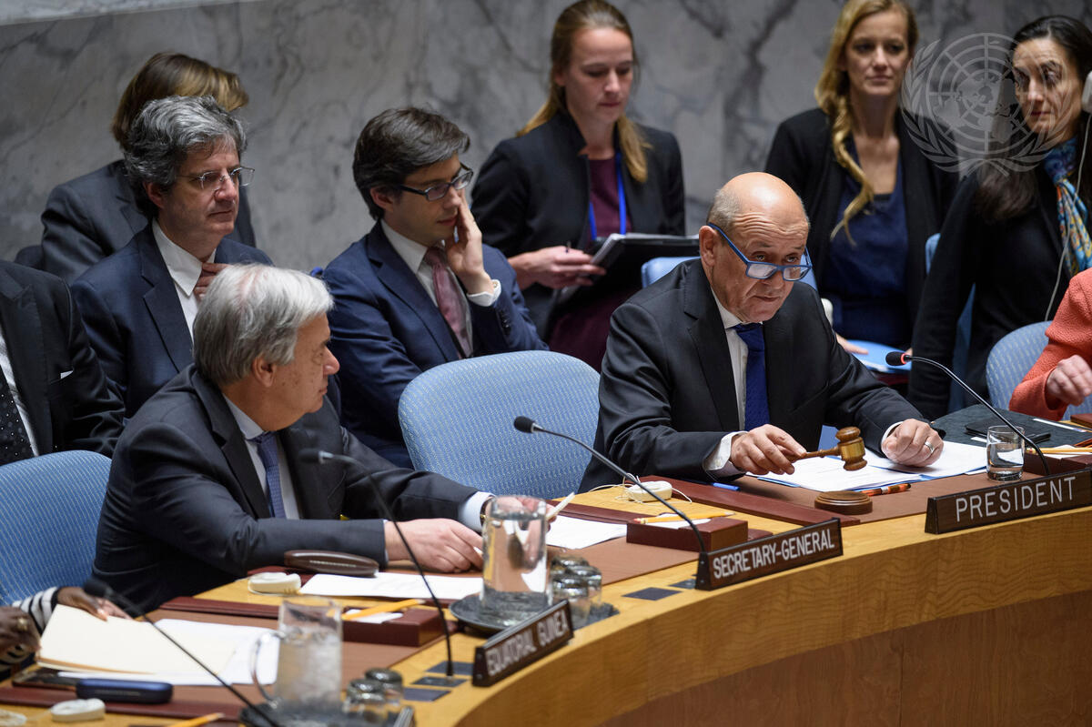 Jean-Yves Le Drian (right), Minister for Europe and Foreign Affairs of France and President of the Security Council for the month of March, chairs the Security Council meeting on the situation in Mali. At left is Secretary-General António Guterres.