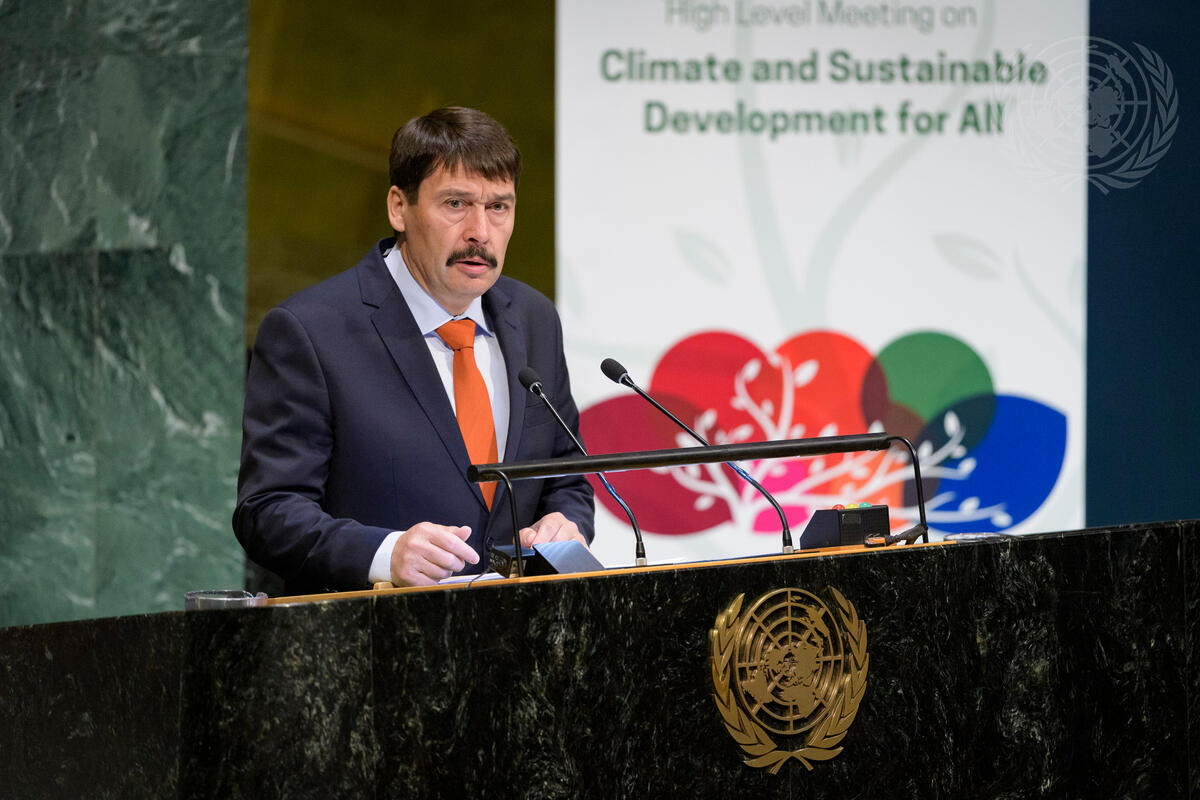 János Áder, President of Hungary, addresses the high-level meeting on Climate and Sustainable Development for All. The meeting was themed ""Protection of the Global Climate for Present and Future Generations of Humankind in the Context of the Economic, Social and Environmental Dimensions of the 2030 Agenda for Sustainable Development"".