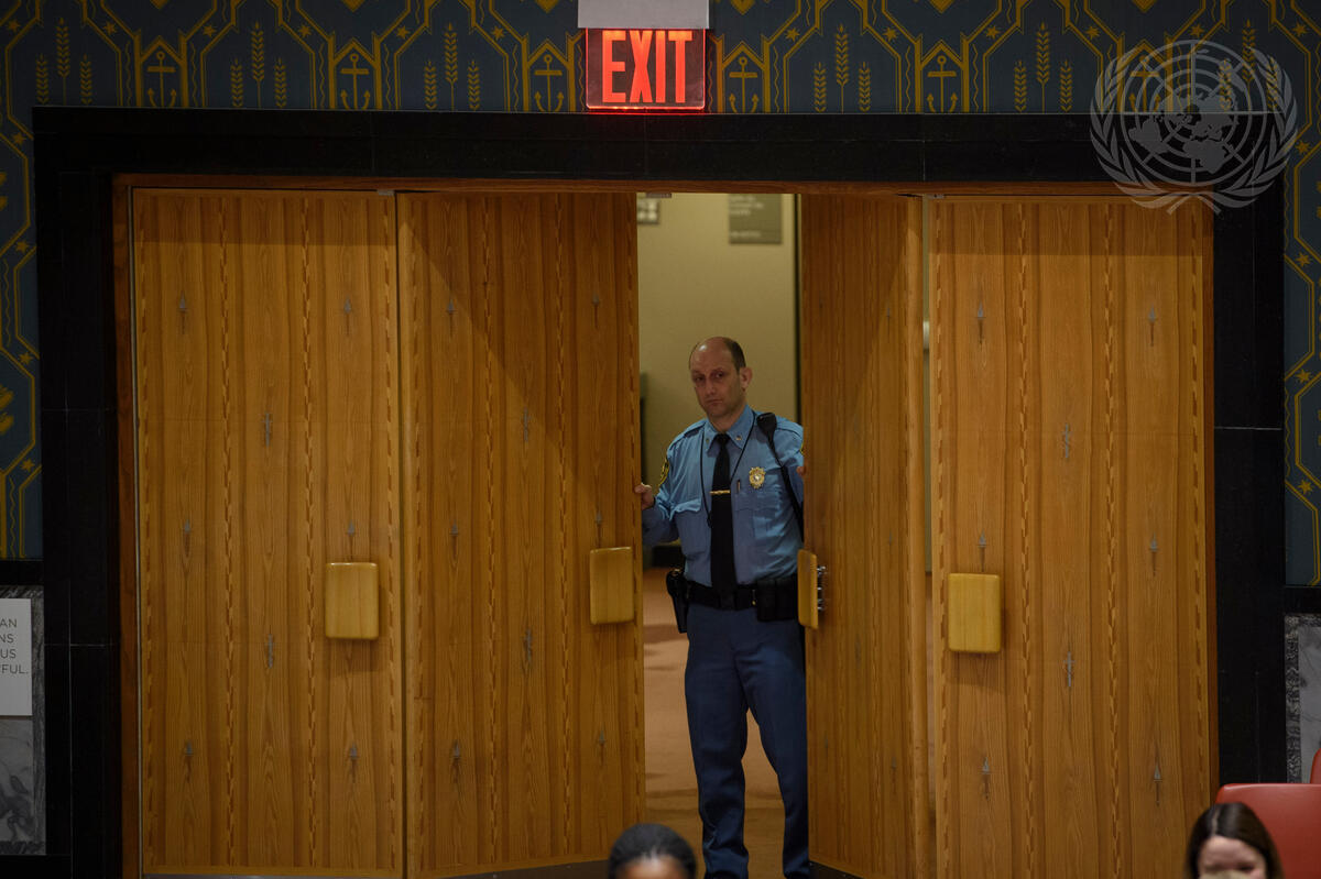 A UN Security Officer closes the door to the Security Council chamber as the Council starts the meeting on the Sudan and South Sudan.
