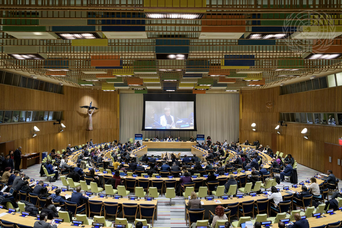A wide view of the room as Inga Rhonda King (on screen), seventy-fourth President of the Economic and Social Council (ECOSOC), speaks at the informal meeting on ""Getting to know the Economic and Social Council system in the Sustainable Development Goals era"".