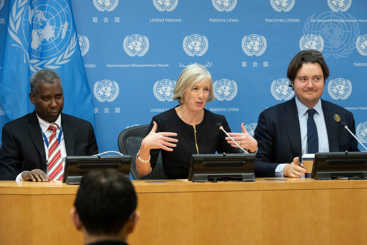 Stefania Giannini (centre), Assistant Director-General for Education for the United Nations Educational, Scientific and Cultural Organization (UNESCO), briefs press on the occasion of the International Day of Education (24 January), in recognition of the role of education for peace and sustainable development.