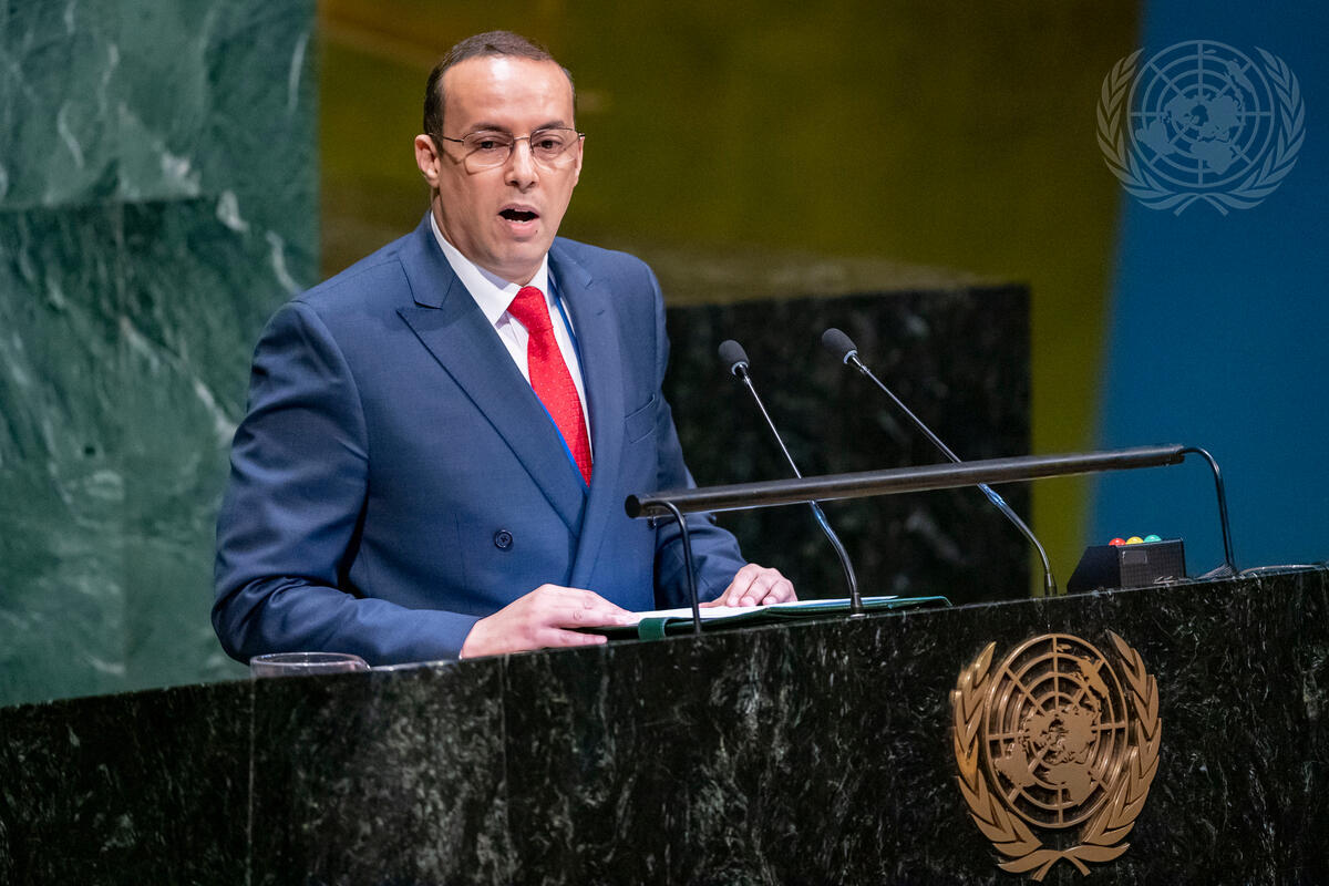 Hicham Oussihamou, Minister Plenipotentiary of the Kingdom of Morocco to the United Nations and Rapporteur of the Fifth Committee, reports to the General Assembly.