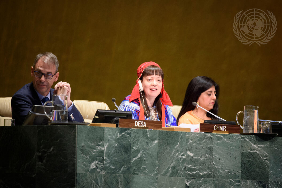 Anne Nuorgam (centre), chairs the opening of the eighteenth substantive session of the Permanent Forum on Indigenous Issues themed ""Traditional knowledge: Generation, transmission and protection"". At left is Elliott Harris, Assistant Secretary-General for Economic Development and Chief Economist of the Department of Economic and Social Affairs (DESA).