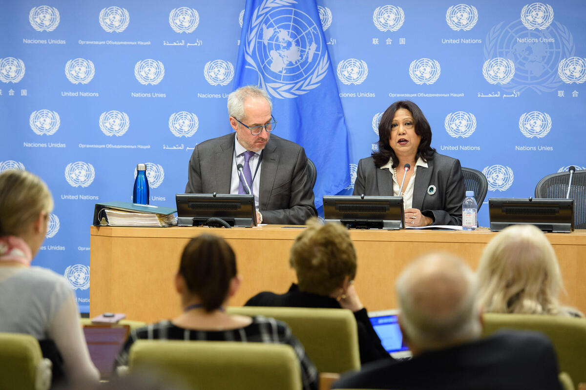 Pramila Patten (right), Special Representative of the Secretary-General on Sexual Violence in Conflict, briefs reporters as a guest at the noon briefing. At left is Stéphane Dujarric, Spokesman for the Secretary-General.