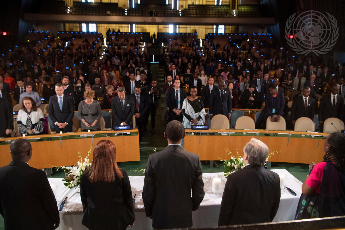 In the foreground, with their backs to camera are (right to left): Esther Mujawayo-Keiner, Co-founder of the Association of Widows of April’s Genocide (AVEGA) and Survivor of the 1994 Genocide against the Tutsi in Rwanda; Secretary-General António Guterres; Paul Kagame, President of the Republic of Rwanda; María Fernanda Espinosa Garcés, President of the seventy-third session of the General Assembly; and Marcel Uwineza, Jesuit Priest and Survivor of the 1994 Genocide against the Tutsi in Rwanda.
