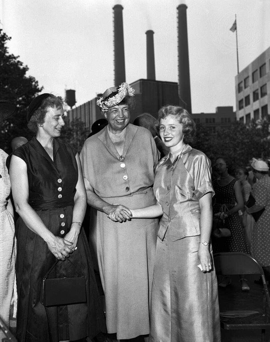 Seen here, from left to right, at the ceremony : Mrs. Sherman Adams, wife of the Governor of New Hampshire, representing the Governors' Wives Committee; Mrs. Eleanor Roosevelt, member of the Board of Directors of the AAUN, and Miss Joy Price, a high school girl from Seattle (where the idea of the gift originated).