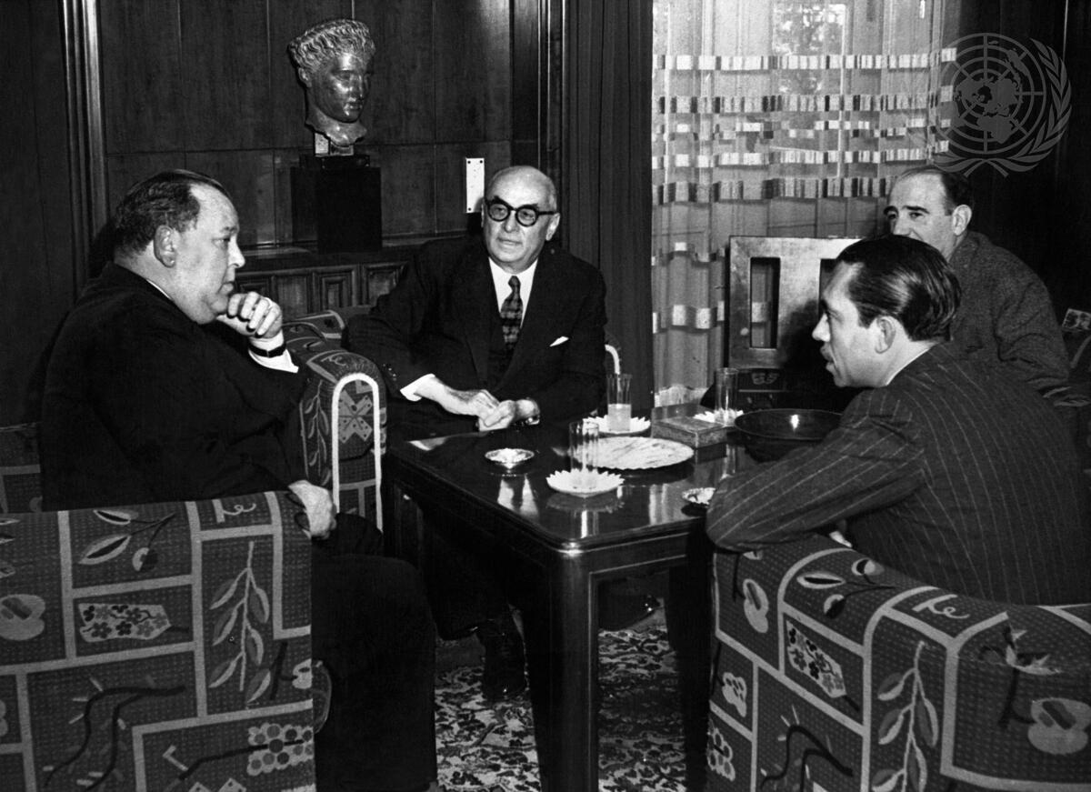 While in Turkey, Mr. Trygve Lie (left), United Nations Secretary-General, met Turkish leaders. This picture, taken in Ankara, during one of these meetings shows (l. to r.) Mr. Trygve Lie; President Celal Bayar of Turkey; an interpreter; and (partly hidden) Professor Fuat Koprulu, Ministter for Foreign Affairs. Mr. Lie's other contacts included talks with Premier Adnan Manderes.