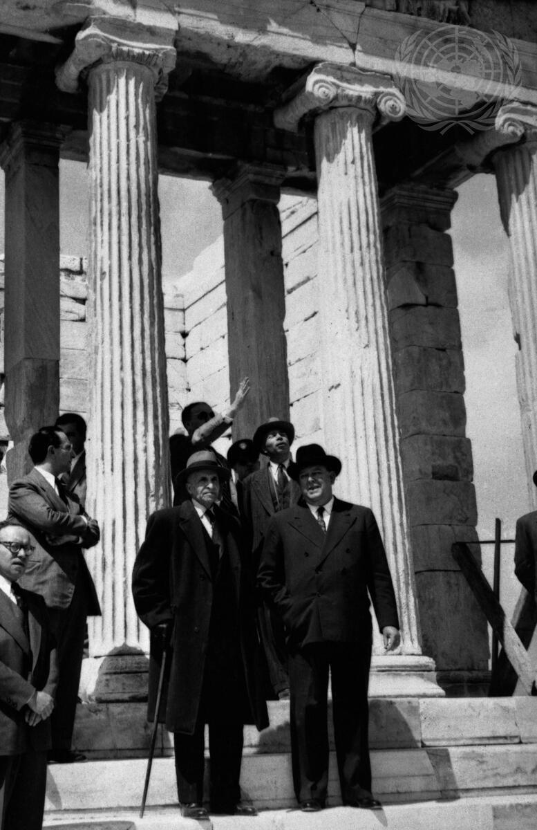 While in Athens, during his recent trip to Europe and the Middle-East, Mr. Trygve Lie (right), U.N. Secretary-General, and his party inspect the ruins of the Acropolis. They are here on the steps of the Temple of Nike Apteros (the Wingless Victory). Beside Mr. Lie is Professor Theofanides, Curator of the Athens Archaeological Museum; at the extreme left, Mr. A.H. Feller, Principal Director of the U.N. Legal Department.