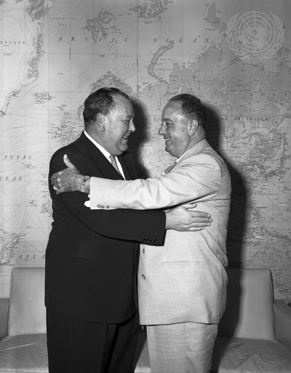 Gen. Anastasio Somoza (right), President of the Republic of Nicaragua, paid an official visit to United Nations Headquarters on 17 June 1952. President Somoza is seen here being greeted by U.N. Secretary-General Trygve Lie.