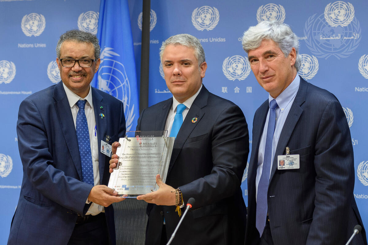 Iván Duque Márquez (centre), President of Colombia, receives an award during a press briefing from Tedros Adhanom Ghebreyesus (left), Director-General of the World Health Organization (WHO), in recognition of Colombia’s work to combat measles and rubella. Also present is Juan Pablo Uribe, Minister of Health and Social Protection of Colombia.