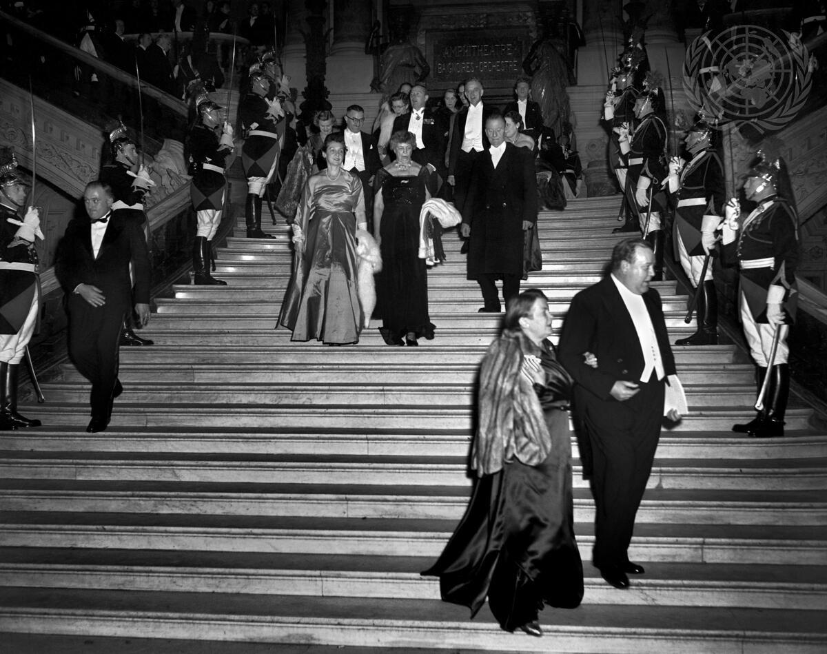 A gala performance, presided over by Mr. Vincent Auriol, President of France, was given at the Paris Opera for the U.N. Delegates. Mr. and Mrs. Trygve Lie are shown here leaving the theatre. In the background, Mme Vincent Auriol, left and Mrs. Roosevelt can be seen. [No exact date]