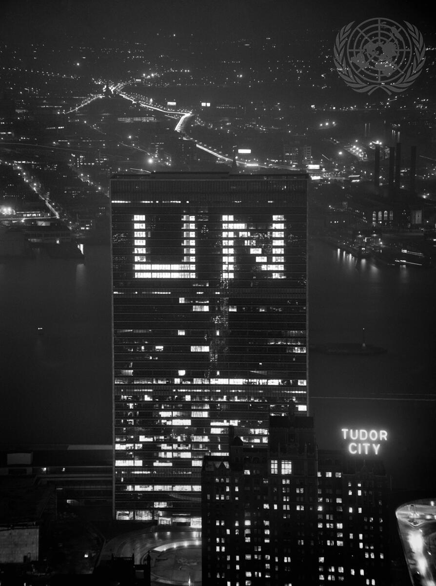 A view of the sign UN lit up on the Secretariat Building, part of UN Headquarters in New York. [No exact date]