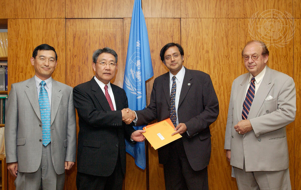 Under-Secretary-General Shashi Tharoor (second from right), receiving a donation from Ambassador Kim Sam-hoon (second from left) Permanent Representative of the Republic of Korea. On the extreme left is Boonam Shin, Counsellor, Permanent Mission of the Repubic of Korea and on the extreme right is Raymonds Sommereyns, Director, Outreach Division, Department of Public Information. The donation will finance the International Training Workshop ""Education and Public Information Outreach on the Millennium Development Goals (MDGs)"" in Beijing, in September 2004.