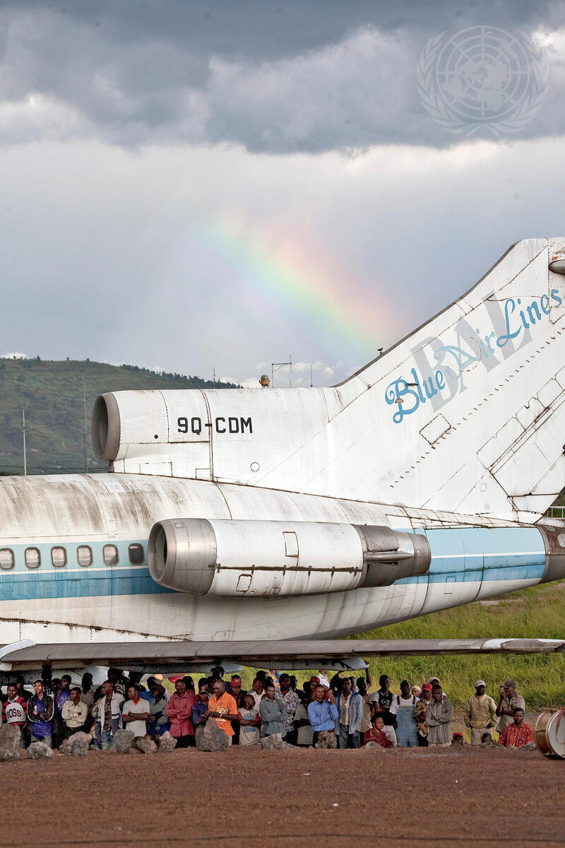 Local spectators listen to inauguration speeches during the launch of runway reconstruction of the Goma International Airport, under the shade of an abandoned airplane.
