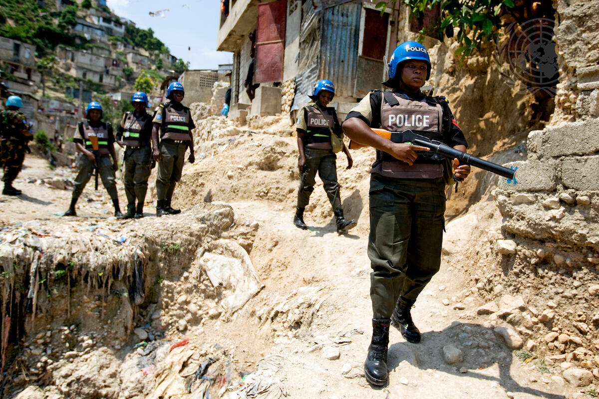 Members of a Nigerian Formed Police Unit (FPU) patrol Martissant, a depressed urban area on the outskirts of the Haitian capital, Port-au-Prince. Nigerian FPUs have worked in collaboration with the UN Stabilization Mission in Haiti (MINUSTAH) since December 2007.