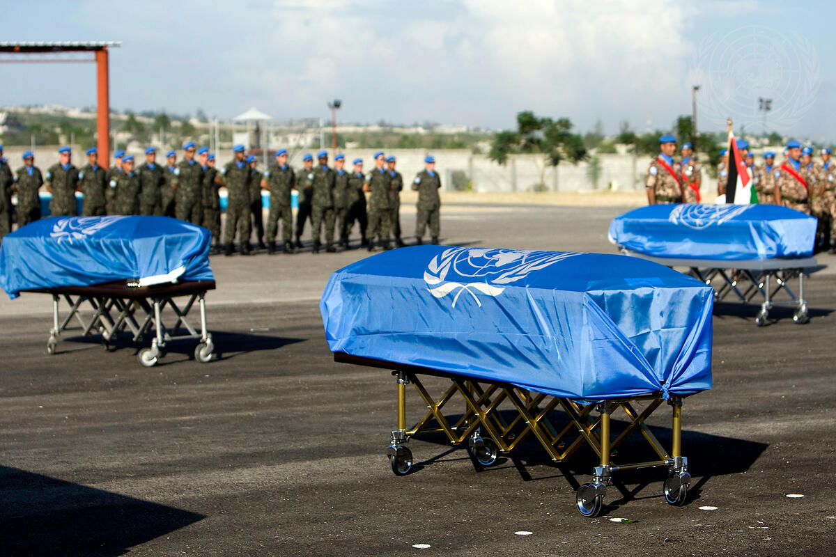 UN peacekeepers mourn the death of 11 of their fellow officers at a memorial service in Port-au-Prince, Haiti. Six Uruguayan and five Jordanian peacekeepers who served with the United Nations Stabilization Mission in Haiti (MINUSTAH) were killed when their plane crashed into a mountainside in southeast Haiti. MINUSTAH reported the plane had been on a regular reconnaissance flight.