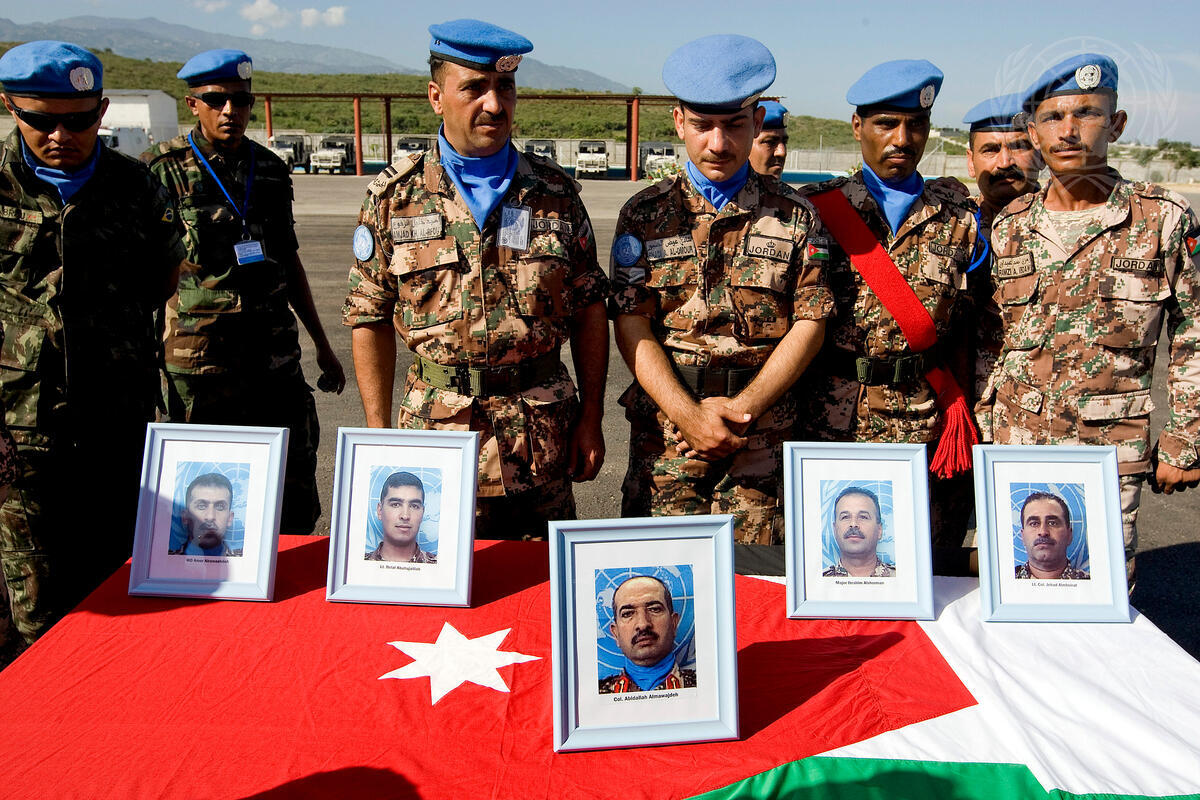 Portraits of the five Jordanian UN peacekeepers, killed in a plane crash over southeast Haiti on 9 October 2009 along with six Uruguayan peacekeepers, are displayed at a memorial service in Port-au-Prince, Haiti. The officers, who served with the United Nations Stabilization Mission in Haiti (MINUSTAH), were reported to have been on a regular reconnaissance flight. Behind the portraits, MINUSTAH peacekeepers mourn their fellow officers.