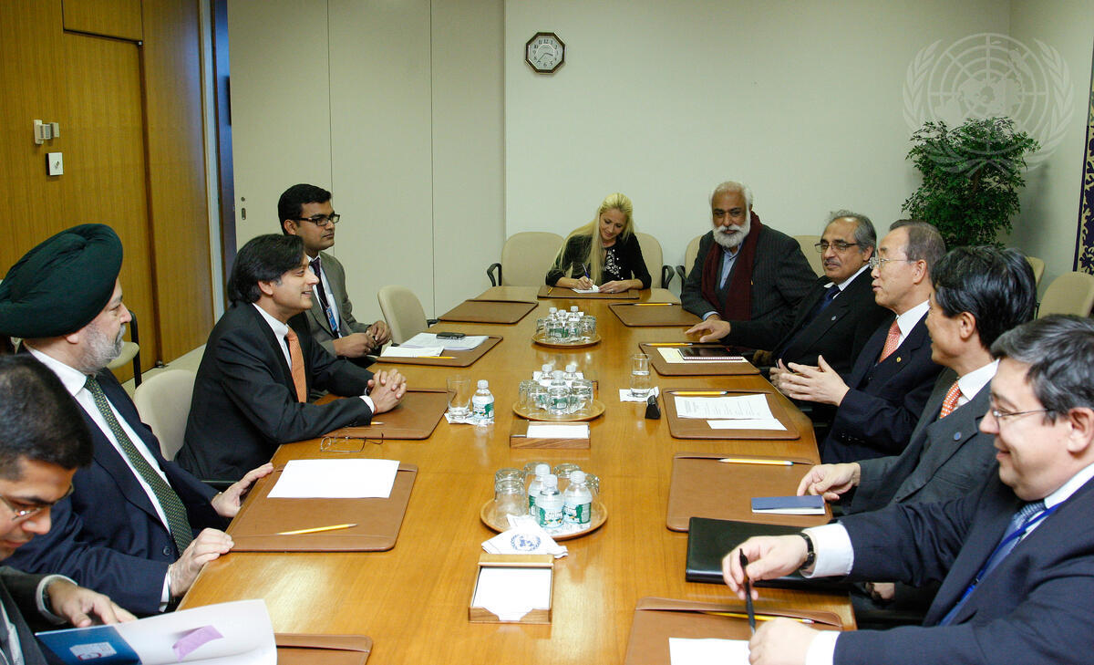 Secretary-General Ban Ki-moon (centre right) meets with Shashi Tharoor (centre left), Minister of State for External Affairs of India.