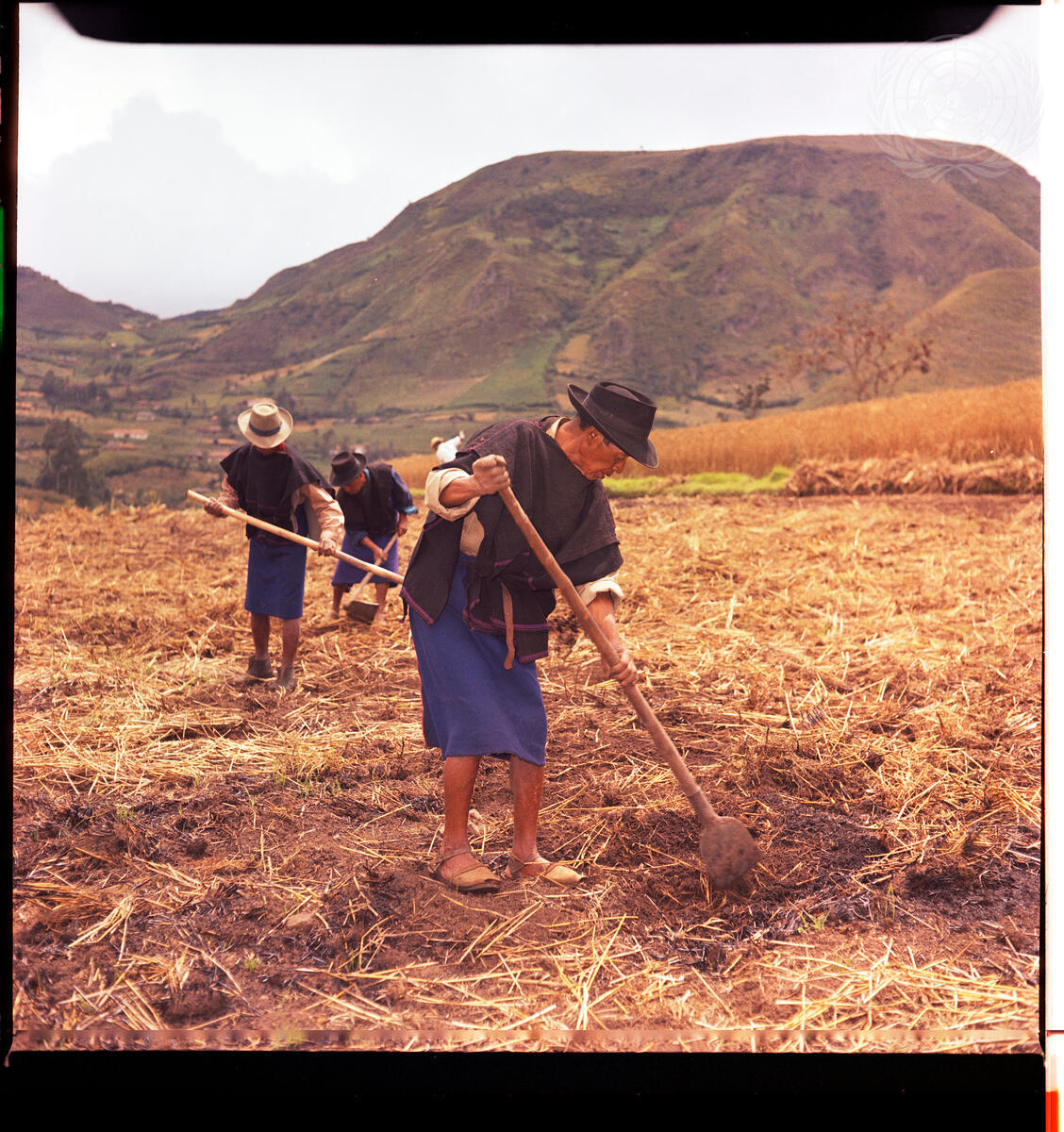 Members of the San Fernando farmers co-op in Guambia township are seen mowing weeds and cultivating a field for the potato crop. [May 1966]