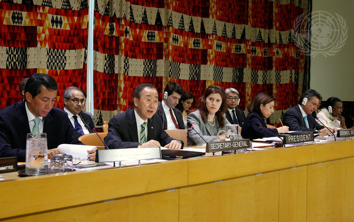 Secretary-General Ban Ki-moon (third from left) addresses a high-level special meeting of the Economic and Social Council with the Brettonwoods Institutions, the World Trade Organization, and the United Nations Conference on Trade and Development on the impact of the global financial and economic crisis on development.